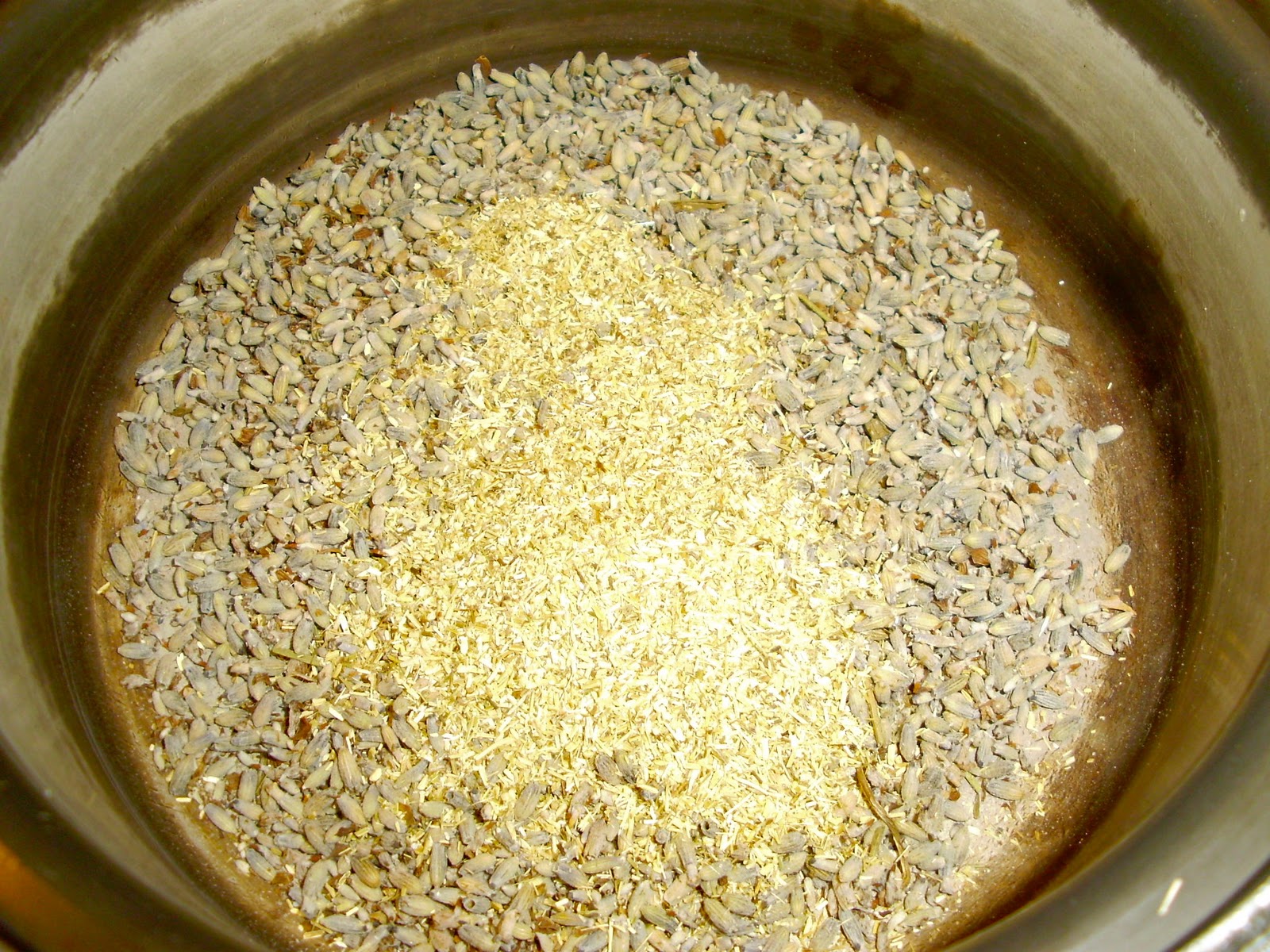Put lavender buds and contents of chamomile tea bags into a small saucepan.